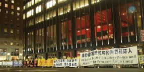 胡13日到达纽约时,新华网号称有5000人欢迎他,其实只有500人左右花钱买来的欢迎团。另一边法轮功的请愿才是真正的声势浩大。胡走的时候,“送”他的也只有法轮功学员。胡锦涛访问北美,法轮功学员一路奉陪。请愿的横幅在他所到之处纷纷展开。