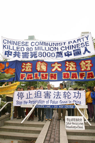 来自美国旧金山的法轮功学员王萍表示,加拿大的皇家骑警非常支持法轮功,16号胡锦涛快来酒店的时候,加拿大皇家骑警特别过来对学员说:你们站好了。后来,胡的车队来酒店时,真的就是从我们的横幅前面经过。
