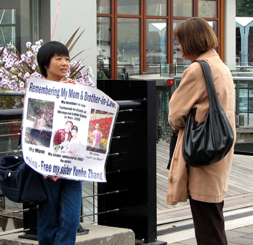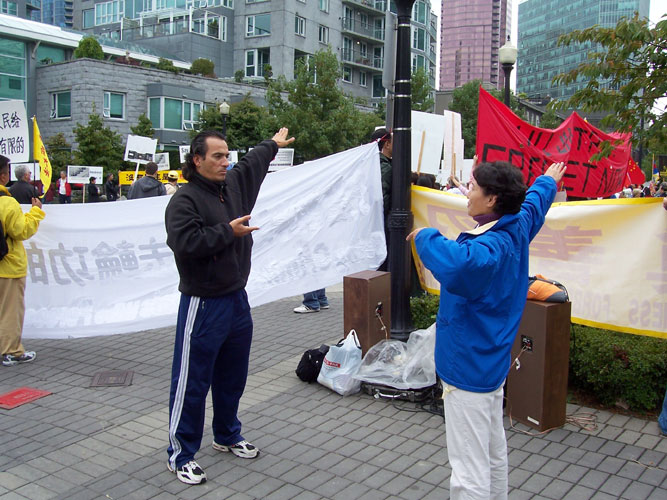 ![]() 路人在学功 | ![]() 加拿大电视台在现场采访 | ![]() 路人在了解真象 |