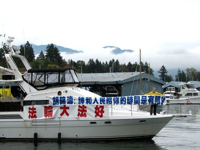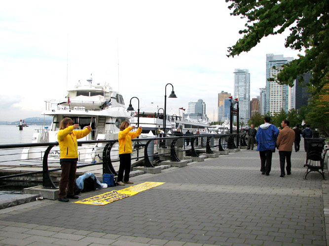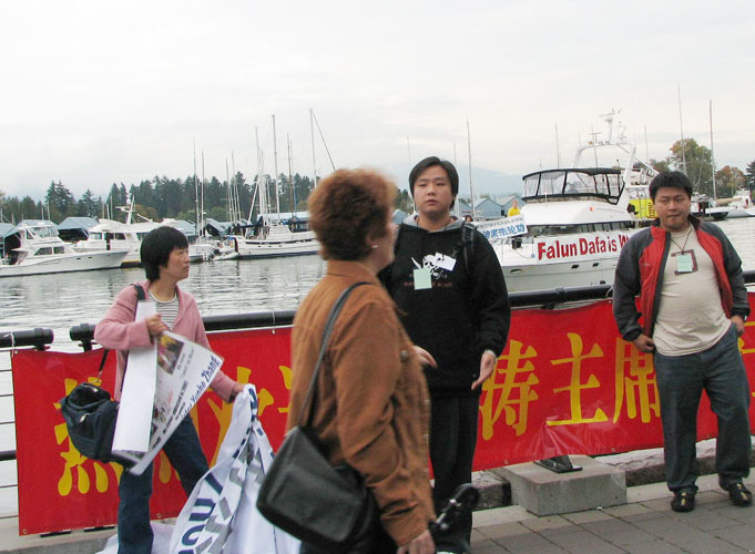 ![]() 亲共人士在偷偷观看学员炼功 | ![]() 加拿大居民(穿棕色外套的女士)制止亲共人士抢学员横幅 | ![]() 很多住在酒店的中方人员看到行游在窗外的游艇 |