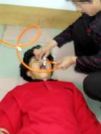学员朱娥这样说:……。好几个人按着我,用很粗的胶皮管子插入鼻孔,我咳嗽得很重,喘不过气来,从鼻子插進,从嘴里出来,鼻子出血,嘴里大口大口的吐血,她们说死也得插進去,经常灌一次食插五、六次,我多次几乎窒息,其实插進管子不给灌多少东西,但是每天必须插两次,每次我都是死里逃生。