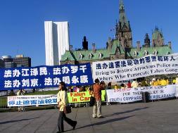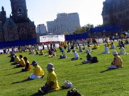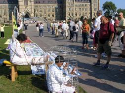 在烈日下,来自多伦多、蒙特利尔、渥太华以及金斯顿的学员连续两周在首都渥太华办反酷刑展。他们大多是老年弟子。有几位已经年逾古稀。许多经过反酷刑展的加拿大人被她们的在烈日中,为同胞呼吁的精神所感动,都签名支持停止迫害法轮功。一位来自金斯顿的阿姨说,国内的同修因为坚持信仰,在真正的承受着酷刑,比起他们来,我们吃的这点苦真的不算什么。