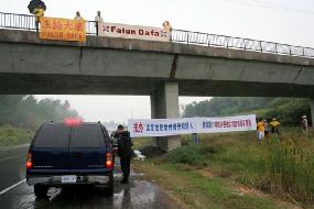 ![]() 在旅馆前的这条路上,胡锦涛的车队来往十多次,每次都从法轮功学员打出的横幅和“9评”退党横幅前经过 |