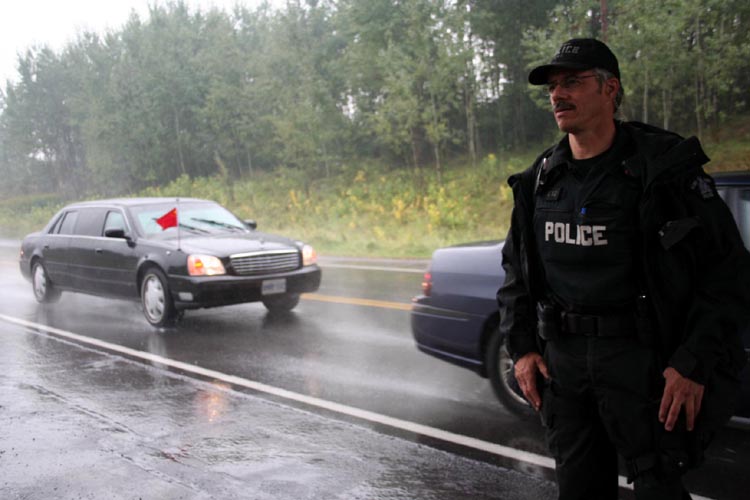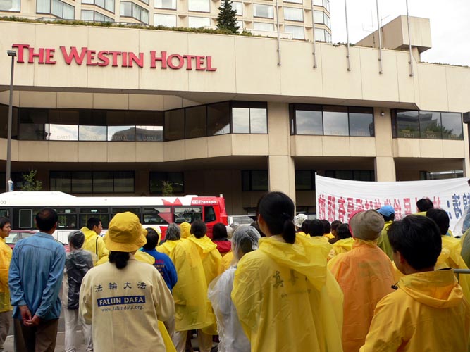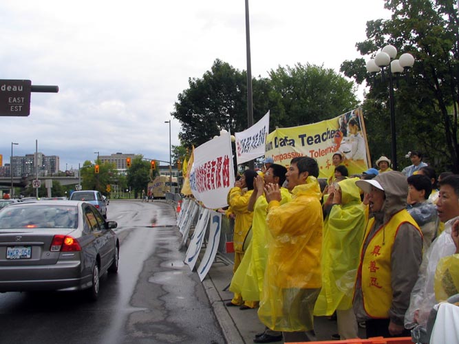 8日,胡锦涛一早在瓢泼大雨中抵达渥太华,并驶往WESTIN 旅馆。法轮功学员沿途冒着大雨,打出横幅:“法办江泽民、罗干、刘京、周永康”,“法办迫害法轮功的恶警和坏人”,“胡锦涛,神和人民给你的时间是有限的”,以及“停止迫害法轮功”、“法轮大法好”等信息。