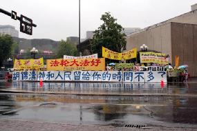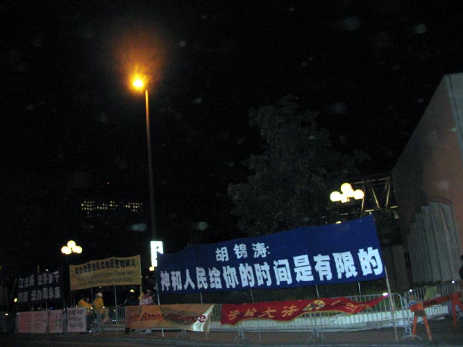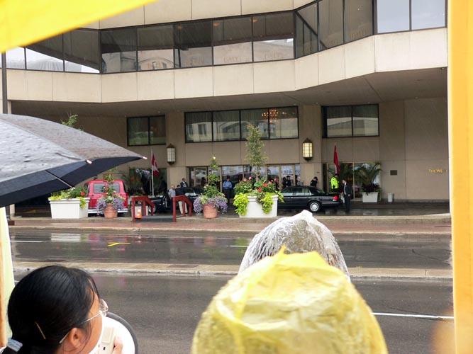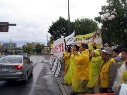 据来自多伦多的张梦华介绍,为了给胡锦涛明白真象的机会,法轮功学员们一直在大雨中坚持,许多学员,包括一些老年学员一直到下午都没有吃一点东西,但是大家精神状态都很好,非常协调一致。