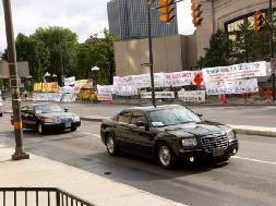 ![]() 在机场到旅馆的路上,学员们打出横幅等待胡锦涛的到来 | ![]() 胡锦涛一行车队经过 |