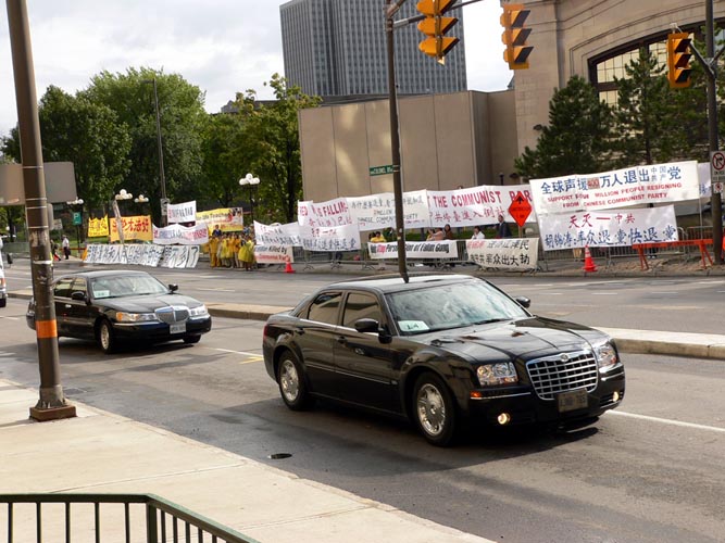 法轮功学员智静回忆当时的情景时说,“给我印象最深的是,胡锦涛离开的那天早上,大约7点,我们开始在旅馆前面炼功,之后,大家开始呼喊口号;说是呼喊,其实我当时的体会是那声音更像是发自心底的慈悲的呼唤;一个学员带头,声音铿锵有力、平静而又坚定,其余的学员随之整齐的一个字、一个字的脱口而出;我感觉当时那个场十分纯正,连听不懂中文的西人学员都受到了感染,许多学员流下了眼泪。大家都在发自内心的呼唤,希望唤醒那个被污染了的灵魂,希望他能够被救度。当时,我们清清楚楚的看到胡锦涛和夫人离我们仅几步之遥。”