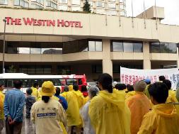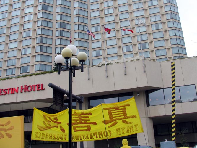 ![]() 从旅馆正门看法轮功请愿现场 |