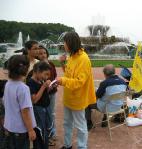 一对美国夫妇认出了正在炼功的学员夫妇,原来这对学员夫妇经营了一家餐馆,而这对美国夫妇是餐馆里多年的常客,今天却在大喷泉前见到了,很早就了解法轮功真象的美国夫妇毫不犹豫签名支持营救法轮功遗孤。
