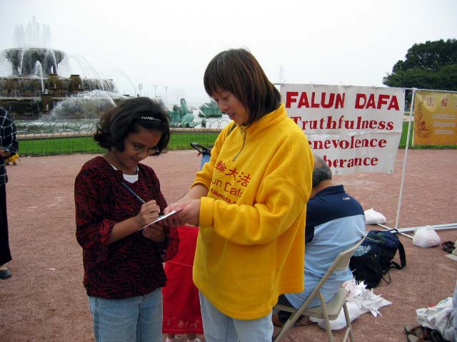 一个美国妇女在观看学员们炼功和真象展板后,坚定的说:“你们做了一件非常正确的事情。”并且签名支持。