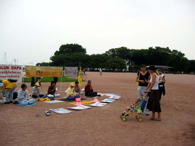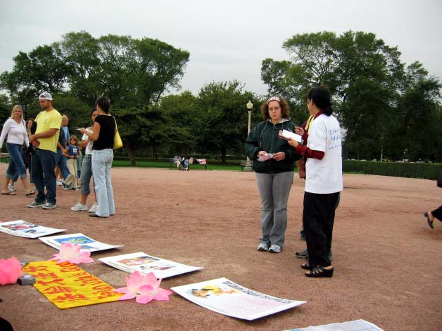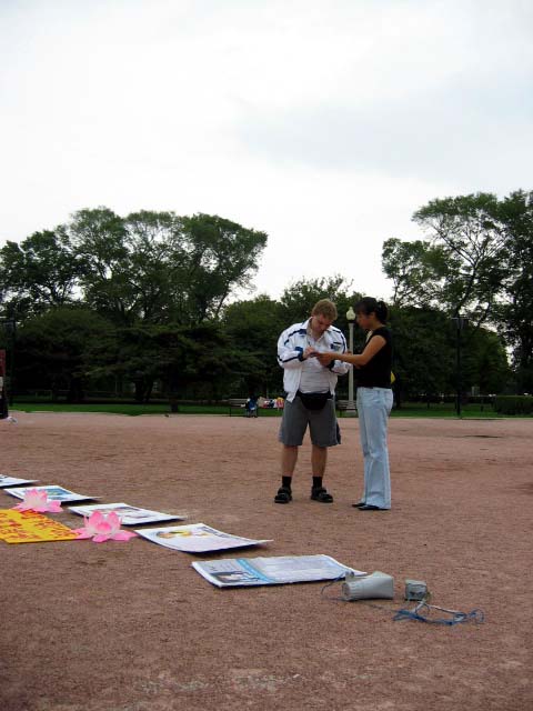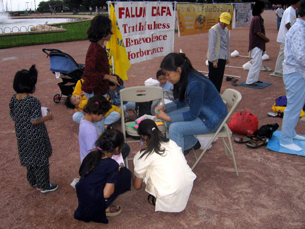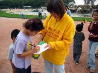 当一个小姑娘和学员们一起学叠纸莲花的时候,她的母亲走过来询问,学员们向她讲述了法轮功,发生在中国的迫害和营救孤儿的真象后,她说:“我的公司两个月前刚刚在中国大陆投资,下个月我就要启程去中国考察了,我真的没有想到还会有这样的事情发生。”在和学员们交流了近半个小时后,她说:“我可不可以多带走一些资料,我要在我的中国之行告诉所有的中国人发生了什么,我想我应该重新考虑我公司的投资了。”