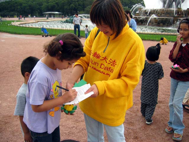 据芝加哥明慧学校负责人肖女士介绍:明慧学校将在白金汉大喷泉前继续展开营救法轮功遗孤的活动,并通过功法展示,图片展板和征集签名的方式让人们了解法轮功真象。一方面利用这个形式带动当地的小弟子们也参与洪法活动;另一方面,用“孩子营救孩子”的方式引起人们的关注,起到制止迫害法轮功的目的。