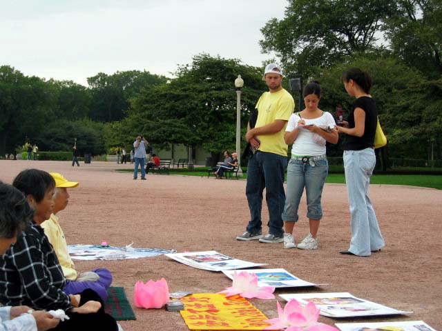 一对情侣在听完真象后,互相问对方:“你能够相信这是真的吗?”随后又驻足很久,看功法表演,看真象展板,询问遗孤的情况,最后说:“我们真的不敢相信所发生的一切,但是我们绝对支持你们,我们决定签名,希望布什总统也能够帮助你们。”