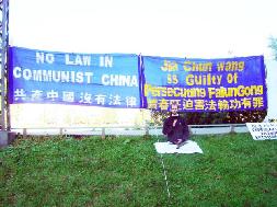 【明慧网2005年9月3日】值胡锦涛访美前夕,华府法轮功学员于2005年9月1日在中国驻美大使馆前举行集会呼吁停止镇压法轮功。他们打出的横幅有:“法办江泽民、法办罗干、法办刘京、法办周永康”;“法办迫害法轮功的恶警和坏人”;“胡锦涛:神和人民给你的时间是有限的”等。