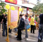 ![]() 人们边排队,边看法轮功真象,边等待学员给他们书写“世界需要真善忍”的祝福卡片 | ![]() 了解真象 |