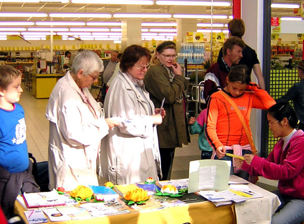 在这两天时间里,学员们利用各种方式向人们介绍法轮功以及发生在中国大陆对法轮功的残酷镇压:有的学员在祥和的音乐声中演示功法,有的在向路人散发真象传单,有的则给善良的德国市民写祝福卡片。边上的大展板贴着法轮功的功法演示图片和中共迫害法轮功学员的酷刑演示图片,桌上则布置了学员自己制作的纸莲花,及各种真象资料。