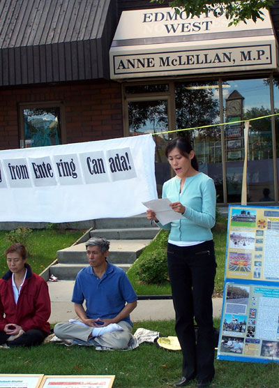 一位来自辽宁省的法轮功学员,在发布会上讲述了她因在天安门和平请愿而被非法拘留一个月,以及在劳教所被洗脑的经历。她呼吁加国政府依据相关反人类罪和战争罪的法律,禁止中共商务部长薄熙来跟随胡的代表团入境加拿大。