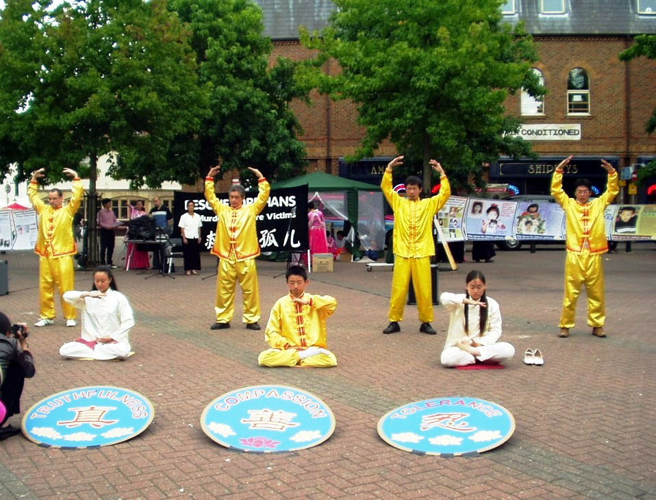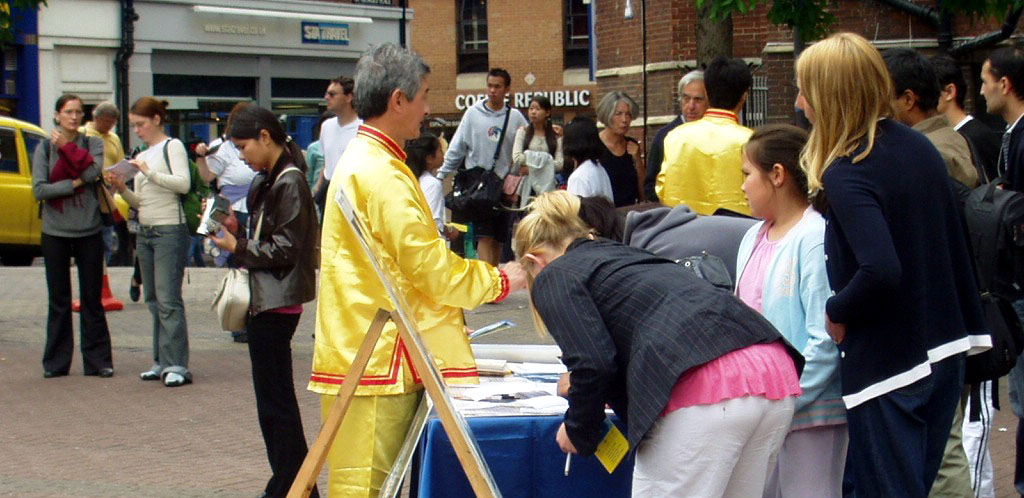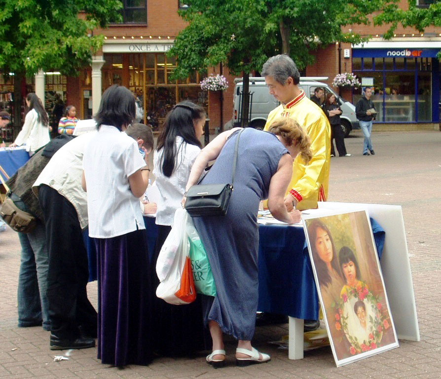 广场上过往的行人中除了英国人,还有许多是到牛津旅游的世界各地游客。人们在营救义演优美的音乐和法轮功学员祥和纯正之场的吸引下,或放慢脚步,或驻足观看。当人们得知义演的主题是为营救法轮功学员的孤儿时,许多人向学员索要真象资料了解更多信息,也有不少人表示已经知道法轮功在中国遭迫害的事,并径直走到征签桌旁签名支持法轮功。