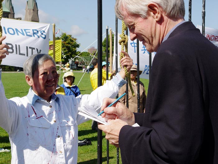 ![]() 加拿大国会议员大卫·乔高(Kilgour)在联名信上签名 | ![]() 国会山前反酷刑展引媒体关注 | ![]() 加拿大人在联名信上签名 |
