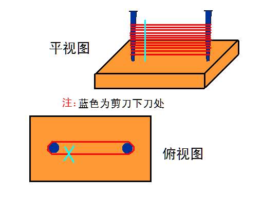 4、缠到两个钉子的上部时,用剪刀剪断一侧的绳。(缠了多少圈,就剪好了多少根挂绳)注意;剪时只剪一侧,剪刀不要刮到另一侧。
