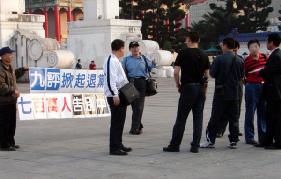 中正纪念堂因为其特殊的历史背景,所以成了许多中国人来台必访之地。法轮功学员在这儿炼功洪法讲真相已有一段时间。这群祥和的,或老或少、或男或女,来自社会各阶层的炼功人,很自然的成为中国大陆游客的焦点。他们就像摊在阳光下的法轮功真相,散发出的真诚善良特质,使中共邪党对法轮功的所有造假宣传瞬间瓦解。刚走了一团大陆游客,又进来了一团,团团都是有缘人,法轮功学员紧紧把握机会讲真相。