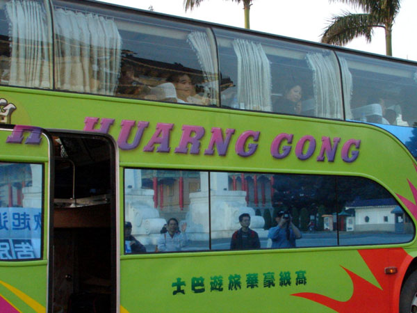 午后,有好几团中国大陆游客陆续到访,突然看到“法轮大法好”的黄色大横幅和这么多炼法轮功的人,好象有点不知所措,几个人窃窃私语,边走边回头看。他们一面走一面听着法轮功学员给他们讲真相。一位大陆游客说他比法轮功学员还明白真相,可是当学员跟他说这里有最新的材料时,他马上接过去迅速的把它放进兜里。当参观完中正纪念堂准备要上车的大陆游客又一次经过炼功的地方时,他们好象下了很大的决心似的,很多人马上抓紧机会迅速的拿起相机快速的拍照,然后若无其事的离开。