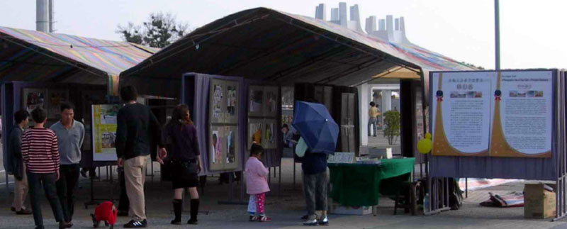 近午时分,一群大陆游客途经展览场旁,他们目光触及展出的照片,随即加快脚步匆匆走过,工作人员上前邀请,前列的几位口中咕哝,双手交叉胸前表示拒绝,当他们即将远去,忽有一人绕进展览场,在服务台前翻阅陈列的材料,工作人员便以“正法之路”画册及其它真相材料相赠,他拿了材料迅速跟上队伍……。约摸过了个把钟头,这群中国游客在回程中重返展览会场,这次他们主动停下,并纷纷索取各项材料,其中更有人指定想看“正法之路”。大家目送这一群远道的游客,心中由衷致上真诚的祝福。