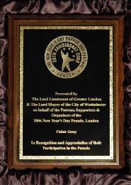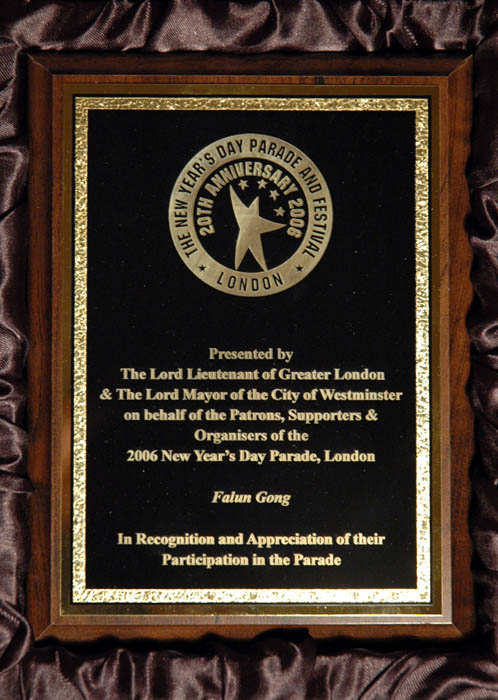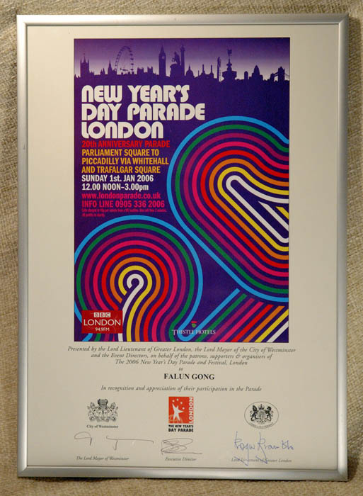 法轮功的队伍获得了由伦敦市威斯敏斯特区行政长官提姆•乔恩纳(Tim Joiner)、伦敦治安长官罗杰•布拉博(Roger Bramble)以及游行主办者颁发的感谢状和证书,感谢法轮功学员的参与。