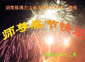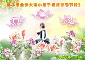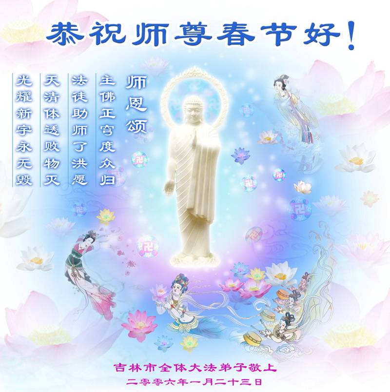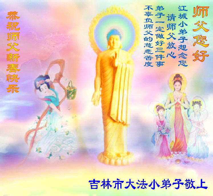 我们是吉林市大法弟子(新弟子),我们老俩口是2005年3月27日得法开始修炼的。得法前我是个酒徒,我的老伴身患可怕的多种疾病,修炼后老伴病都痊愈了,我也戒掉了46年的酒瘾,这是尊敬的师尊给予我们第二次生命!感谢伟大的师尊,感谢大法!我们老俩口诚挚的向伟大的师尊过年问候,祝师尊过年好!