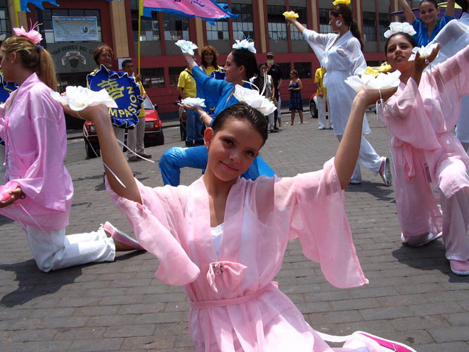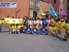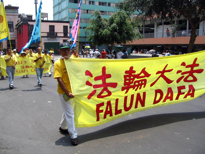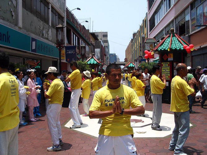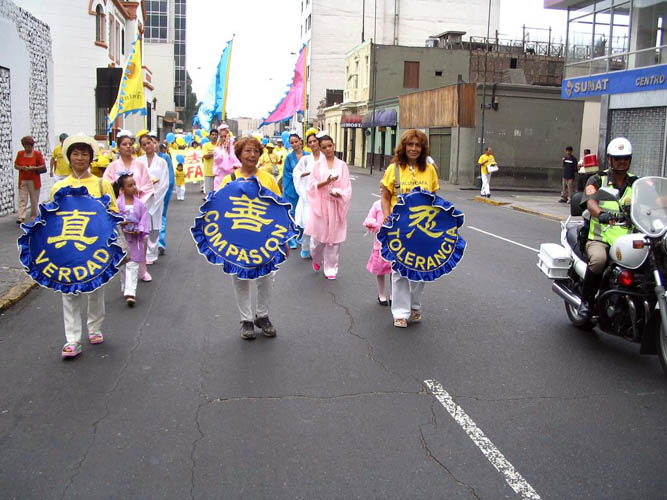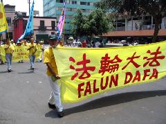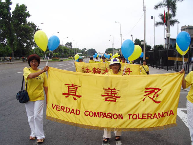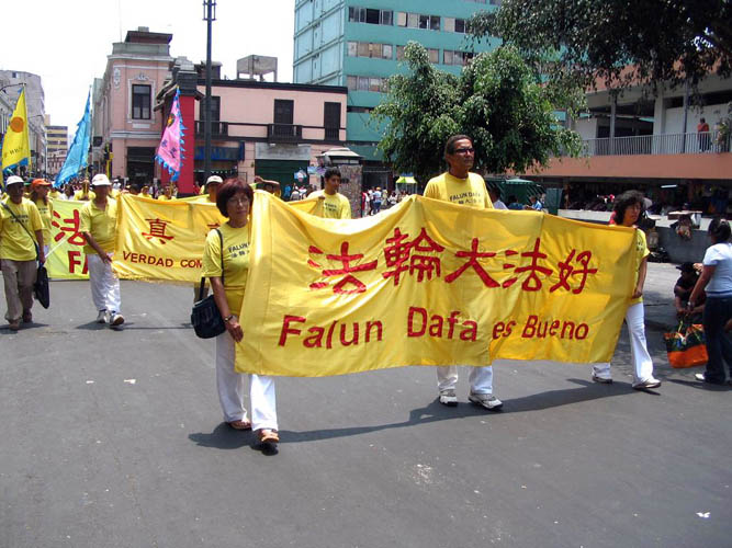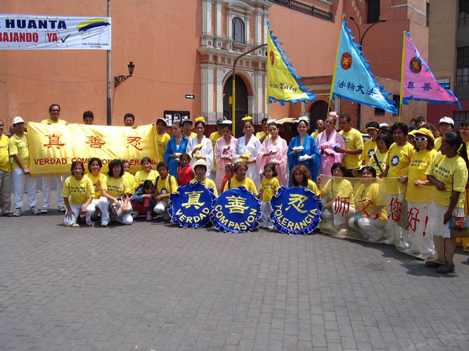 【明慧网2006年1月31日】2006年1月29日,是农历丙戌年正月初一。秘鲁首都利马华人社区迎来了一支神采奕奕的游行队伍。人们惊喜的看到横幅上醒目的“真善忍”,“法轮大法”,“法轮大法好”的大字和引人注目清一色黄色T恤的着装,清楚的知道了这是由法轮功学员组成的游行队伍。