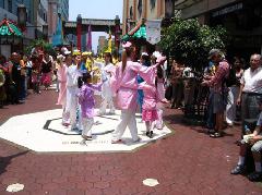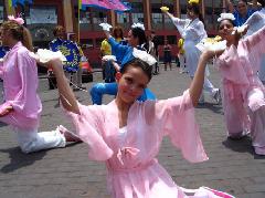 队伍中少女手捧着莲花跳着优美高雅的舞蹈格外的引人注目。观看表演的人们不时的发出惊叹声。在唐人街邂逅相遇的2号电视台工作人员非常高兴的抓拍了舞蹈的全过程。接着学员面向观看的世人,演示了法轮功功法,发放了法轮功真相传单并送上新年的祝福。接到传单的人脸上流露出幸福喜悦的神情。中国游客感谢学员送的写着“法轮大法好”的护身符和新年祝福。