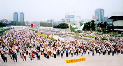 每到一地,我们先去租借举办法轮功学习班的礼堂或录像厅,然后就到公园里炼功。当时公园里晨练的人很多,我们挂出介绍功法的横幅,几个人炼功演示,几个人发法轮功简介和办班通知。一周下来,各市来学炼法轮功的人都很多,最少的一个班也有六、七十人,多的地区比如汕头市,第一次办班就来了好几百人,我们不得不临时换场地。