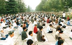 北京法轮功学员一次大炼功场景,约二千人参加。(一九九八年)