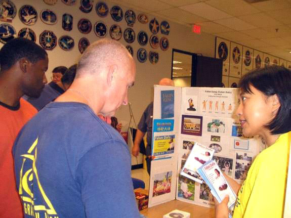 【明慧网二零零六年十月二十一日】美国休斯顿太空城一年一度的“安全与健康日”活动,于二零零六年十月十九日星期四在最大的航空航天局(NASA)举行,当地法轮功学员应邀设摊位展示,让千百名NASA员工感受大法的美好,心灵健康受益。今年法轮功的展位颇获欢迎,许多员工特别欣赏法轮功的音乐,还有不少人对炼功有兴趣,并希望更深入地了解法轮大法真相。