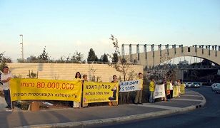 然后学员们分成两组。一组前往中国大使馆,在中使馆对面的广场上摆上了许多展板、图片,揭露在中国发生的对法轮大法弟子的野蛮迫害。学员们还在那里炼功、发真相资料。另一个人数众多的小组前往一个大型商业中心,在那里演示五套功法,向以色列民众讲真相。