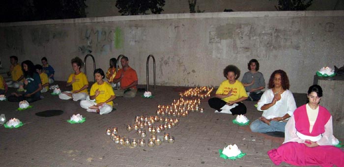 第二天,学员们在特拉维夫市举行了活动,在用中文写的“正法”两个大字的背景下,人们听了两个小时的法轮功学员创作的音乐并感受到大法修炼的美好。