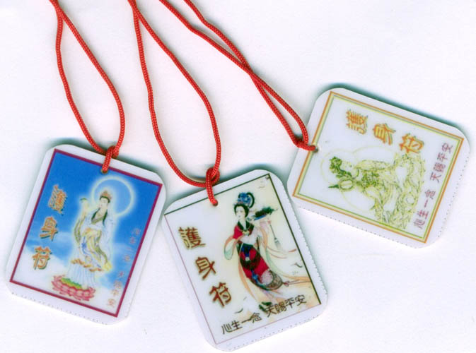 这样,一个个漂亮、精美的护身符就做好了。还可用红线穿好,挂在脖子上。(如图)