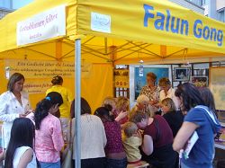 星期五,来了个我们在其它活动中已相识的妇女。她希望能得到有关这场迫害的更进一步的消息,还说她很愿意学法轮功。这位妇女在三天活动中每天都来。在第二天的晚上她有点困惑的对我说:“您知道吗?我几乎都快到家了,但我想,不,我一定要再去一次那个地方,再来见您,于是我又到这里来了。”第三天晚上我们几乎快拆展位时,她突然又出现了。她坐下来告诉我,她在这里感觉非常惬意,这里所有的一切都非常和谐,没有盛气凌人的感觉。这里的人也很友好,彬彬有礼,是她从来没碰到过的。显而易见,她与大法很有缘份,这使她感受到了大法的美好并不愿再离开他。她一直呆到我们快收拾完东西了才离去,并表示她要尽可能快的来学功。