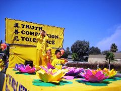 法轮功学员的队伍由横幅、腰鼓队、花车和仙女队组成,将法轮大法的美好及祥和展现给世人。整个游行路程两侧围满了观众,一路上司仪不断的向沿途的观众介绍法轮大法,花车队伍所到之处,不断的赢得阵阵掌声及欢呼声。有的观众脱帽向队伍致敬;有的竖起大拇指叫好;还有几个小孩子合十致意,并高声说:“法轮大法”;有几个中国观众更是被惊呆了,一直目送着法轮大法的队伍。