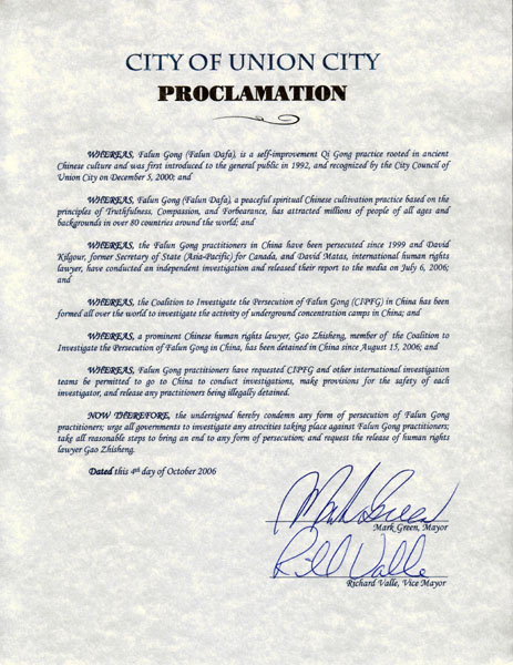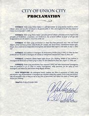 鉴于,法轮功(也称法轮大法)于一九九二年公诸于世,是根植于古老中华文化的自我提升的气功修炼。联合市(Union City)议会曾于二零零零年十二月五日给予法轮功褒奖;
