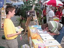 法轮功的摊位也吸引了一位来自纳沙泰尔的广播记者,在仔细听完学员讲真相后,她采访一位法轮功学员。
