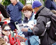 ![]() 丁先生向观众们发放法轮功真相资料 |