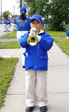 笔者看到一位母亲带着两个儿子一直跟着天国乐团走,并沿途发法轮功的真相资料给路人。这位母亲对笔者说:“我们是韩国人,我们不是法轮功学员,但我儿子的同学Ben是法轮功学员,他在乐团里吹号,他是一个很好的孩子。我们这次全家从多伦多赶来支持他们。”