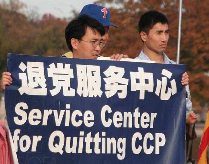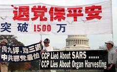 十一日下午,秋高气爽,参加集会的民众聚集在美国国会大厦前的倒影池前,展示出“广传九评”、“退党保平安”、“退党服务中心”等横幅标语,络绎不绝的中国游客纷纷拍照留念,据一位来自中国大陆教师旅行团的游客说,国内很多老百姓在互联网上都看到了《九评》和退党的消息。