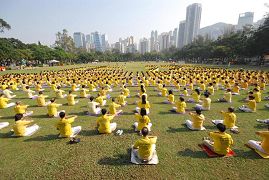 十一月十二日早上,各地学员上千人参加了在维多利亚公园举办的集体炼功活动,并且组成了“正法”两个字。许多学员在下午还参加了香港退党服务中心等团体举办的“广传九评 公开退党 解体中共”声援一千五百万勇士退党大游行。