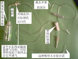 2、制作办法:按需要的长度将输液管截短,将拆下的两头部份再按原样接回截短的输液管上,保证各连接处严密不漏气,再将吸管弯折后短的一头接在输液器的扎药瓶针上,同样要保证严密性,并记得将用来透气的小零件的口用剪下的小块塑料食品袋包上两层后塞回原输液管药瓶扎针上,这样一个密闭的注墨输液器就做好了。取下墨水瓶瓶盖,在上面打一个能轻松穿过吸管的圆洞,备用。