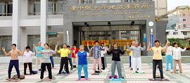 早上家长送儿女上学,以及乡亲游览在这里集合时,都会停下脚步看一看我们炼功。炼功时间是早上四点五十分到七点十分,全年风雨无阻,遇雨就在地政事务所骑楼下,周六早上大家会一起学法。
