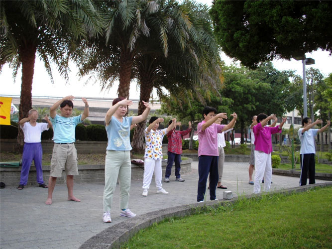 不论是清凉的早晨或是寒风凛凛的清晨,只要在四点五十分至七点十五分经过丰东路的慈济公园,你就可以听见那引人的炼功音乐声、看见优美的功法动作,或听他们一起背诵《论语》或《洪吟》。那么看似不同的人群却都很有默契的做着相同的动作,即使晚到加入行列的也会迅速跟上整体的步调。炼完功后,有人赶着去上班,先离开;有人会一起合作收拾横幅;有人还会留下来一起学法或是交流。