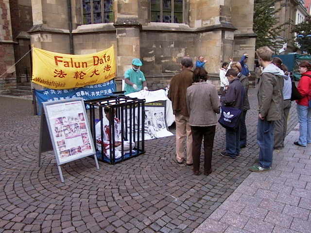 法轮功学员还在现场做了一个小型的活摘器官模拟演示,告诉人们在中国发生的对法轮功的迫害和惨无人道的摘取活人器官的事实。原本谨慎的明斯特居民对接受传单和小册子却十分踊跃。学员们还征集了无数的签名,显然,人们想了解中共独裁下的中国人民是如何饱受压迫的。许多人还感谢法轮功学员们提供这些信息。