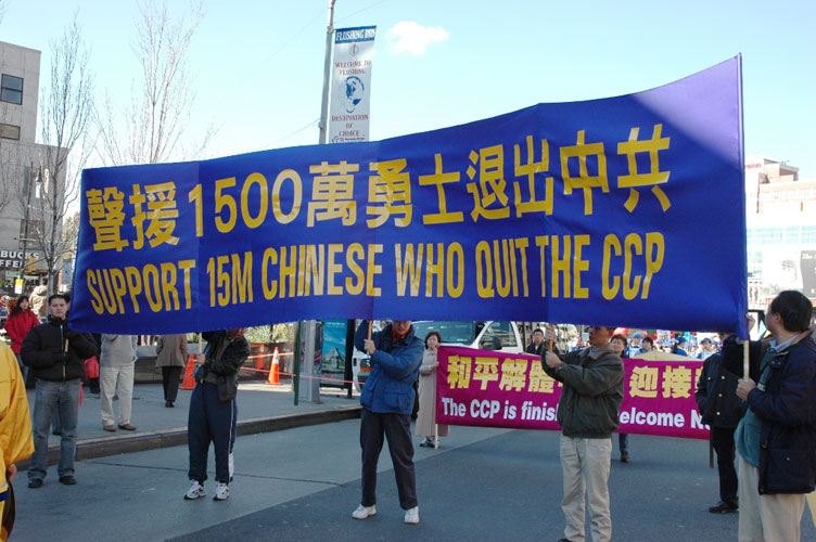 此次声援活动由大纽约地区退党服务中心、全球审江大联盟等团体联合举办。游行队伍在法拉盛热闹的公立图书馆前集合,金狮开道,蓝底白字的中英文大横幅“声援一千五百万勇士退出中共”气势非凡。游行队伍浩浩荡荡,舞狮、乐队、各式各色横幅、腰鼓,走在法拉盛繁忙的马路上,气势恢宏,吸引了众人的目光。不少华人赶紧拿出随身携带的相机、摄像机拍摄,留下这宝贵的历史一刻。